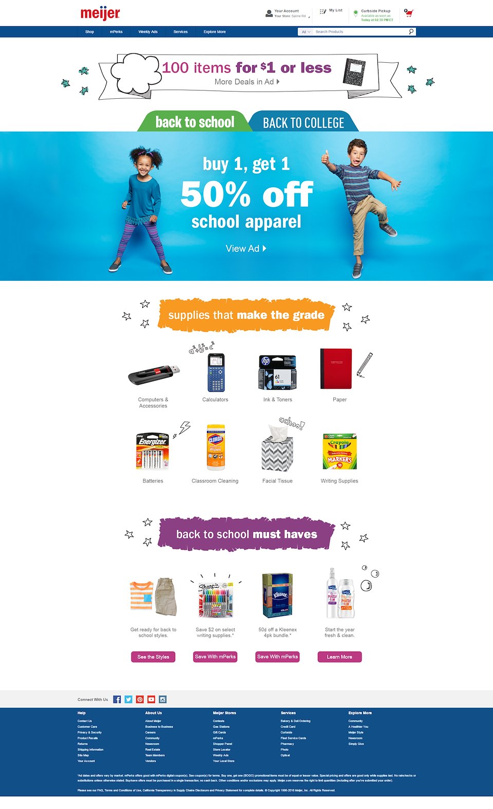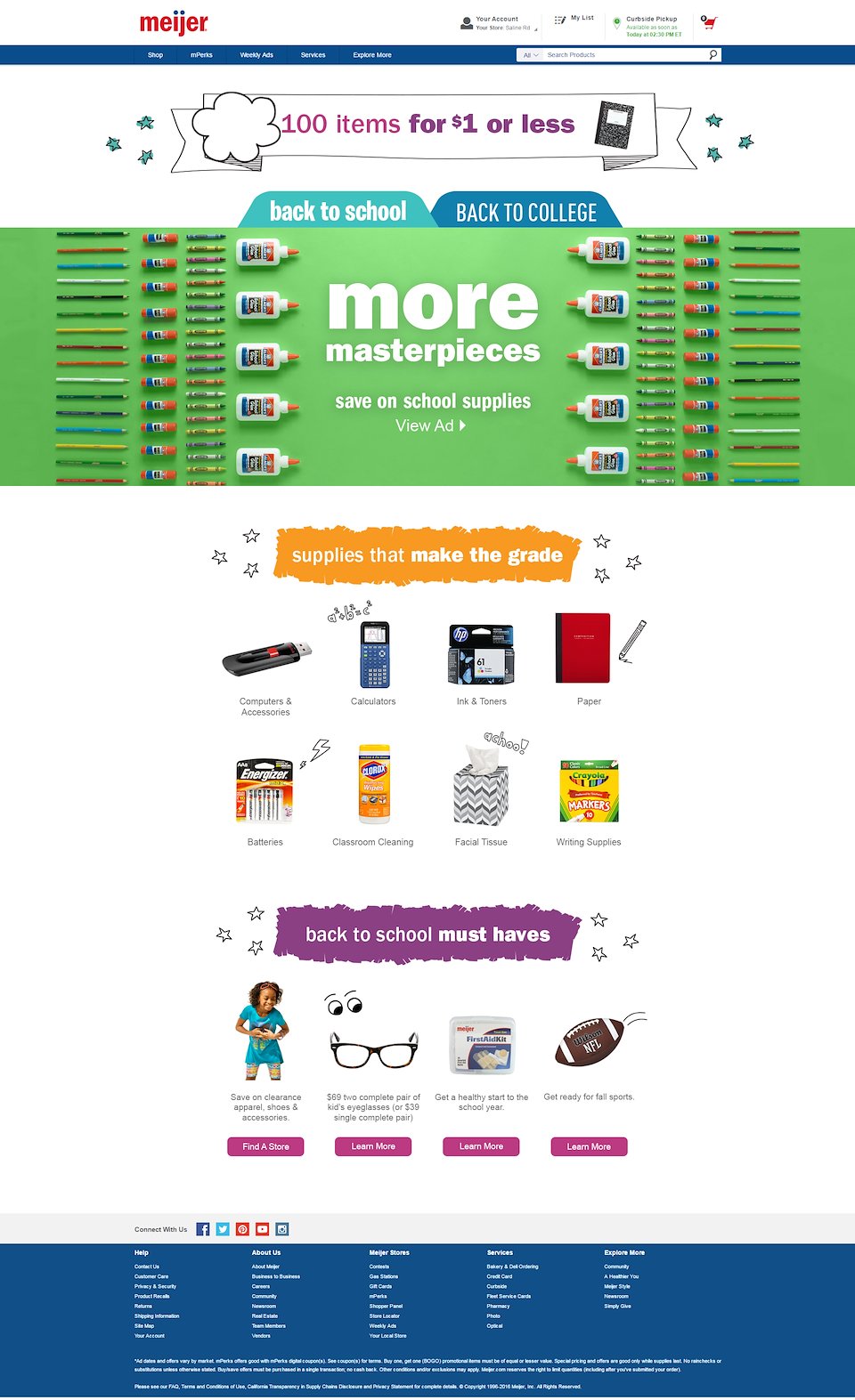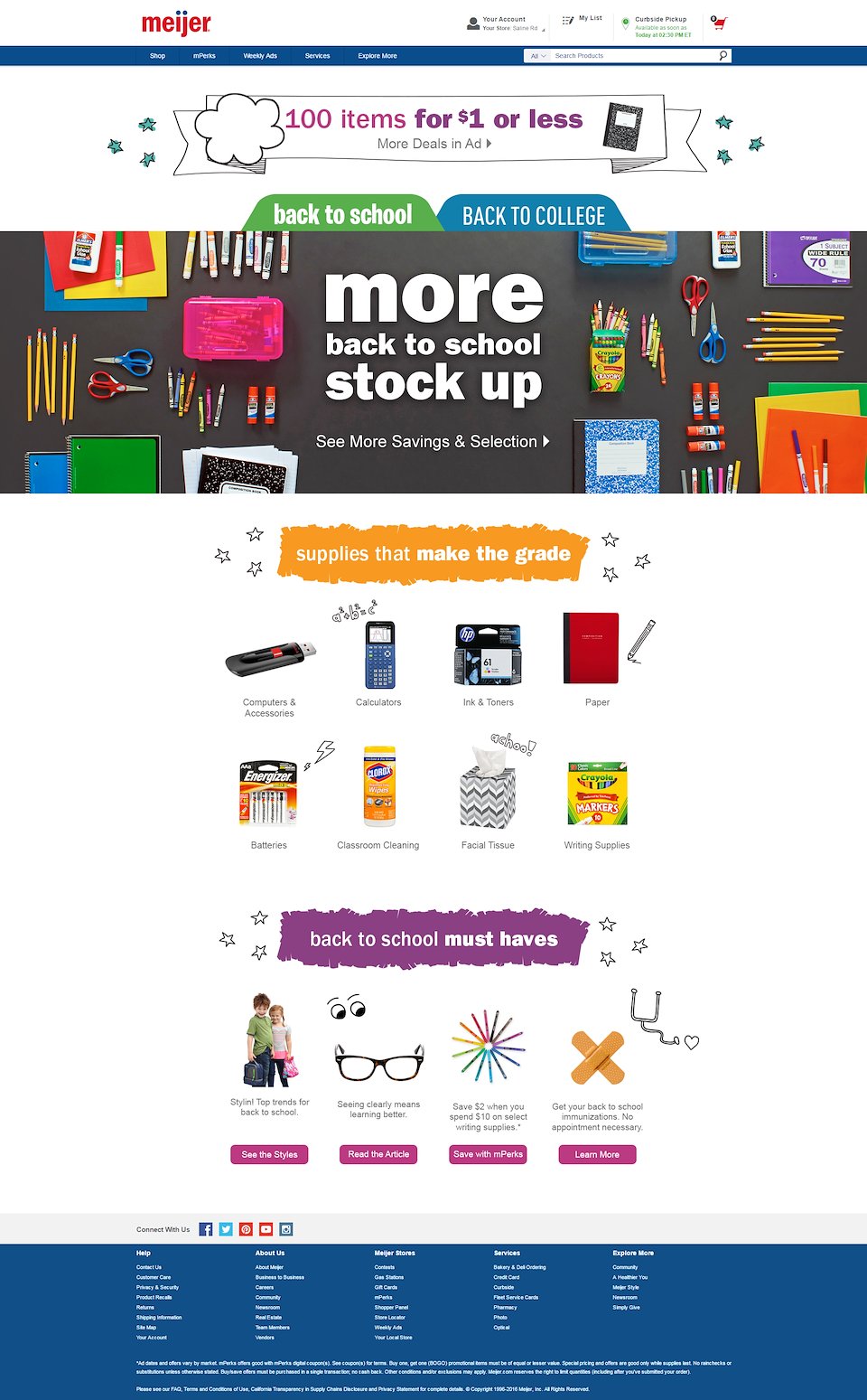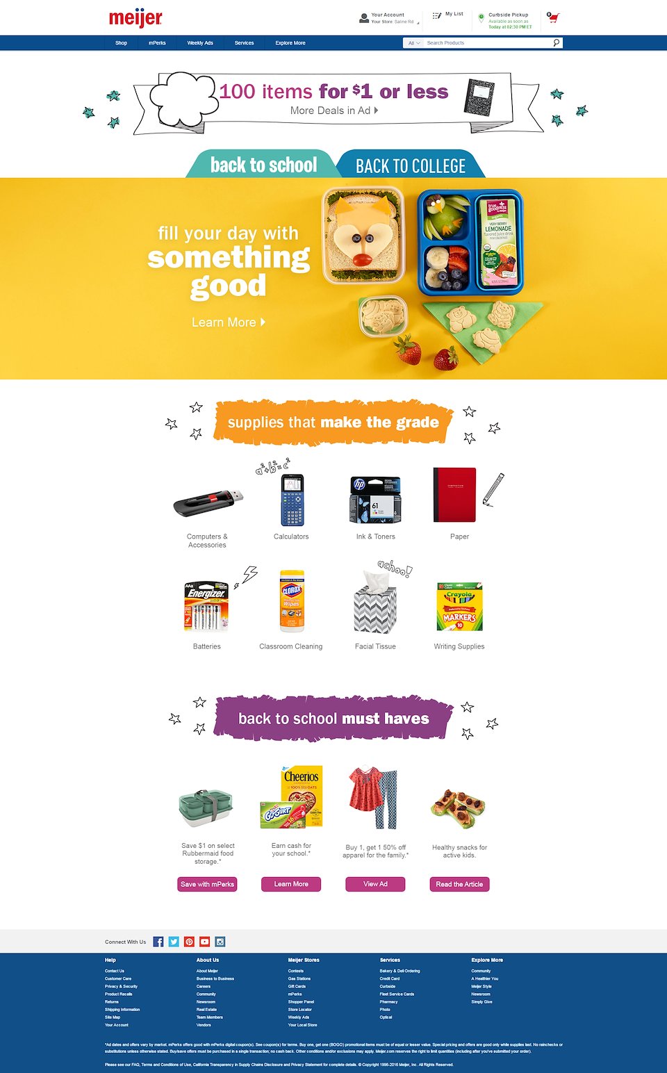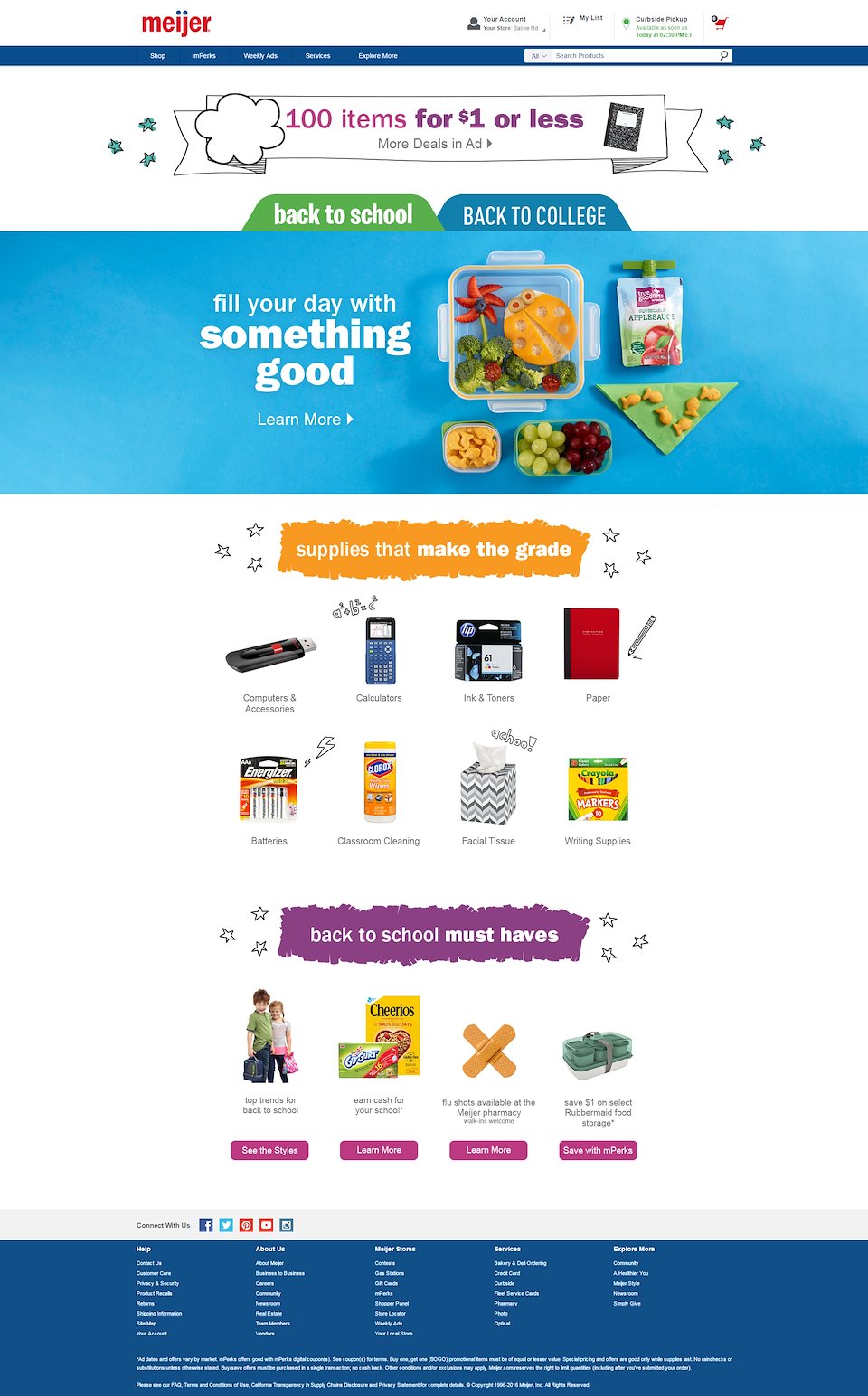 In this project, I created a custom Back to School landing page that featured promotions, wayfinding, and engaging hero content that updated weekly. Small, illustrated elements paired with a bold color palette helped set the mood for this page, making it a successful Back to School experience.
