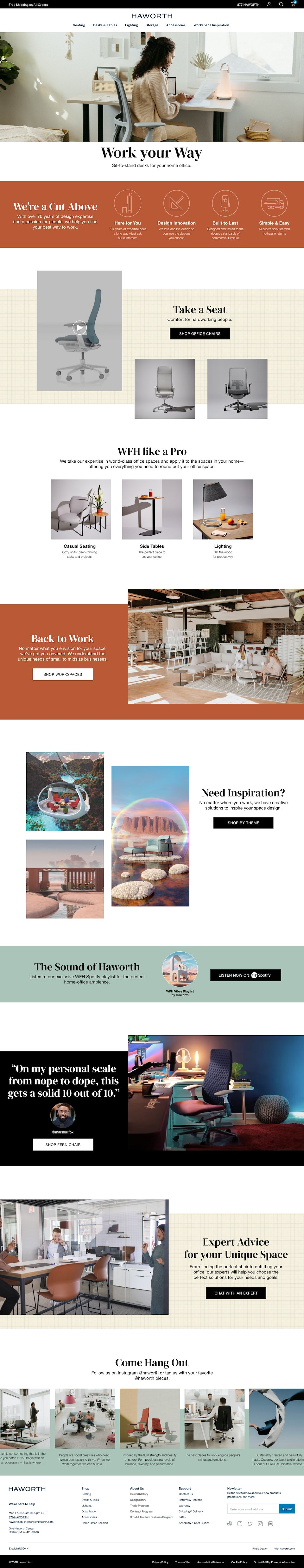 My first project for Haworth was redesigning the homepage. The original homepage was difficult to navigate, lacked a clear messaging hierarchy, and was in need of creative refinement. This document takes you through my thought process and prototyping to the final product.