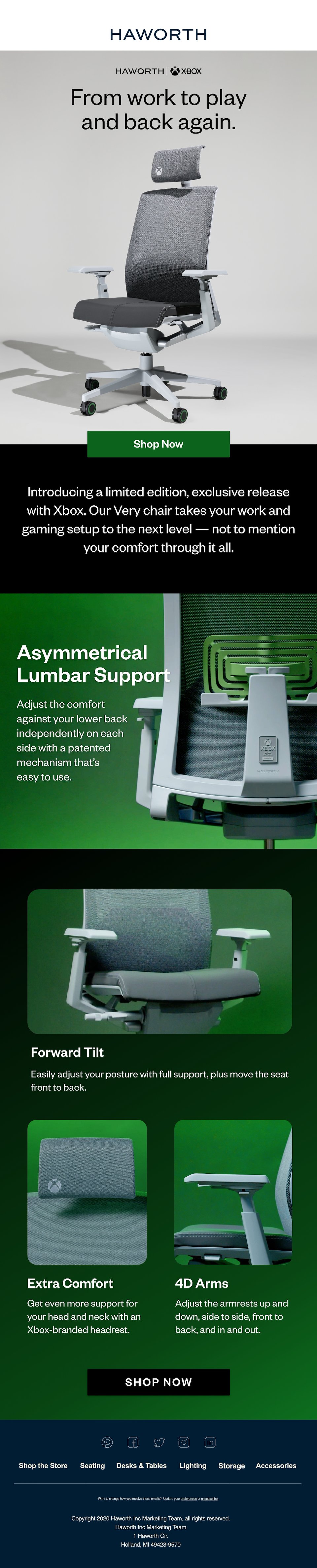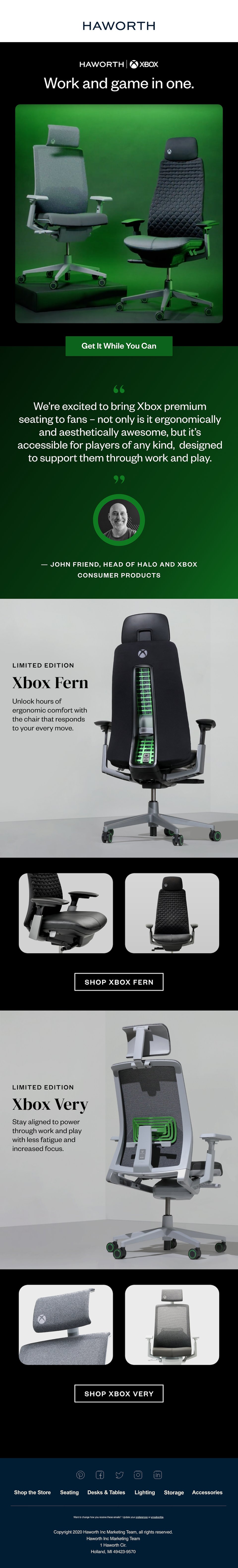 In 2023, we partnered with Xbox to launch two gaming chairs. The project required combining the Xbox and Haworth Consumer style guides to create co-branded assets for our audiences. With consultation from the Xbox team, we were able to publish these assets and meet our launch goals.