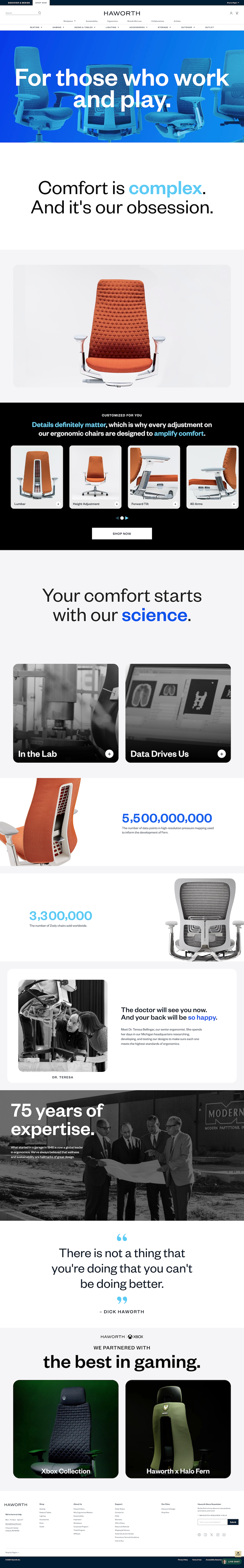 The Haworth Gaming experience was created to introduce our brand as an authority in the gaming chair market. We took a bold approach with our branding, inspired by immersive online experiences and incorporated more interactive elements into the page while creating a compelling argument for Haworth as a leader in gaming.