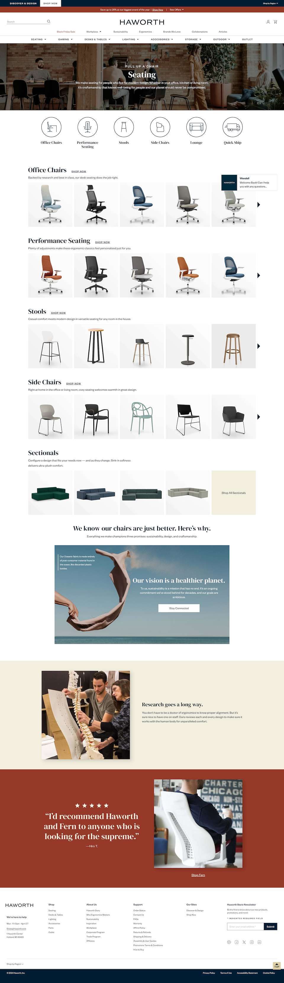 I redesigned the Haworth collection page to promote ease-of-use and conversion. The previous collection page was difficult to navigate and had a high bounce rate. With the redesign, we were able to reduce the bounce rate by implementing clear wayfinding and branding elements.