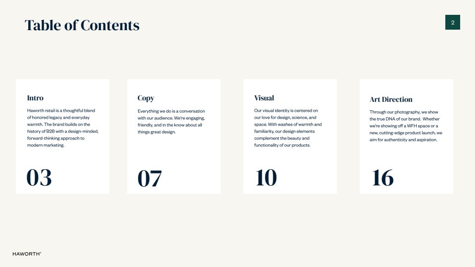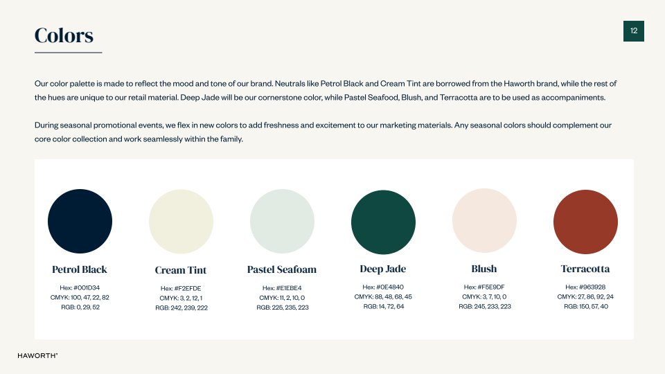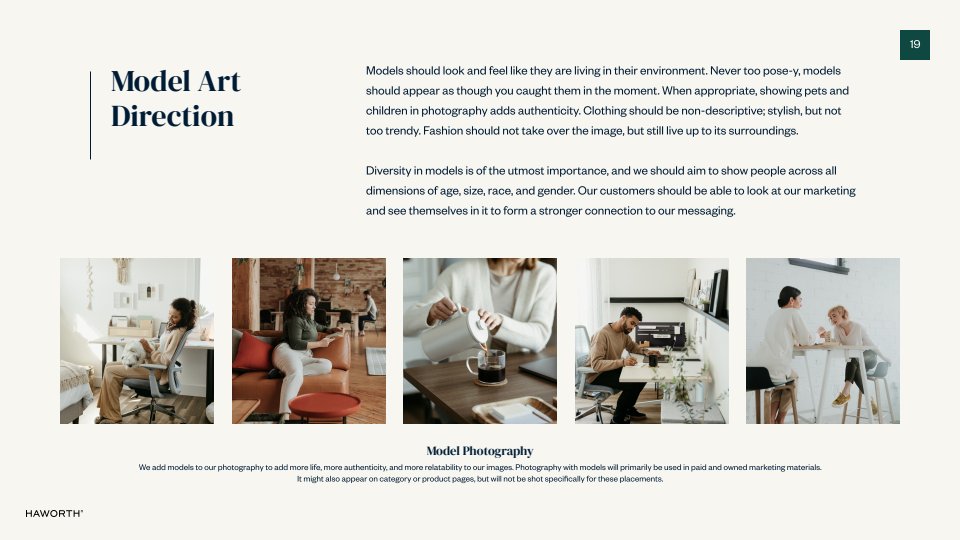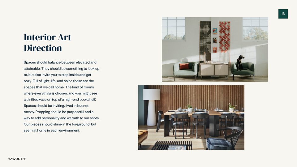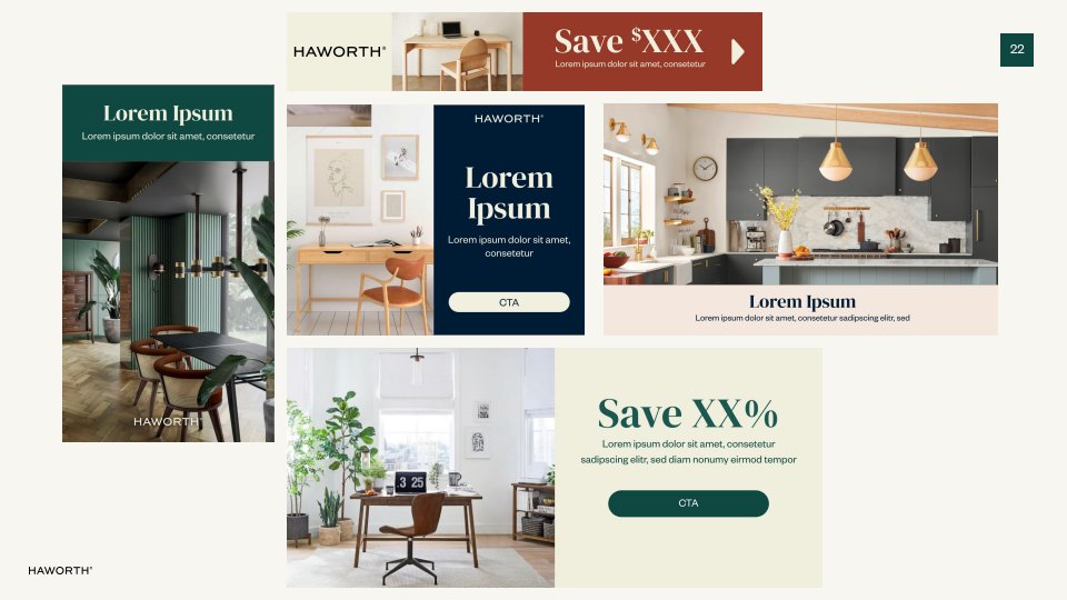 When our team launched the direct to consumer website in earnest, we needed a new brand identity to go with it. I created the Haworth Retail Style Guide to give visuals and voice to our brand ethos. As a historically B2B brand, Haworth struggled to make their creative consumer-friendly. With this in mind, I developed these guidelines to bring warmth and approachability to the brand, which was then implemented across all of our digital collateral.